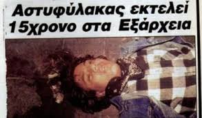 6/12/2008: Ο μαθητής Αλέξανδρος Γρηγορόπουλος, 15 ετών, πέφτει νεκρός στα Εξάρχεια από σφαίρα του αστυνομικού Επαμεινώνδα Κορκονέα μπροστά στα μάτια των συνομήλικων φίλων του. Μετά τη δολοφονία, ο δολοφόνος αστυνομικός όχι μόνο δεν ζήτησε συγνώμη για το ότι σκότωσε τον ανήλικο και άοπλο μαθητή, αλλά προσπάθησε κιόλας να αμαυρώσει την εικόνα του μαθητή με κατηγορίες που εξαπέλυσε εναντίον του. Οι κατηγορίες αυτές (που τελικά διαψεύστηκαν πανηγυρικά) είχαν σαν στόχο να αμαυρώσουν το προφίλ του μαθητή ώστε να δικαιολογηθεί η δολοφονία του στα μάτια της κοινής γνώμης.